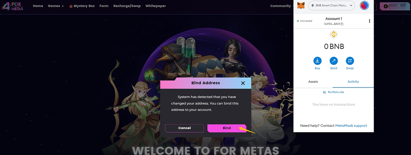 It will automatically remind you bind your BSC address if you are new users just enter For Metas.