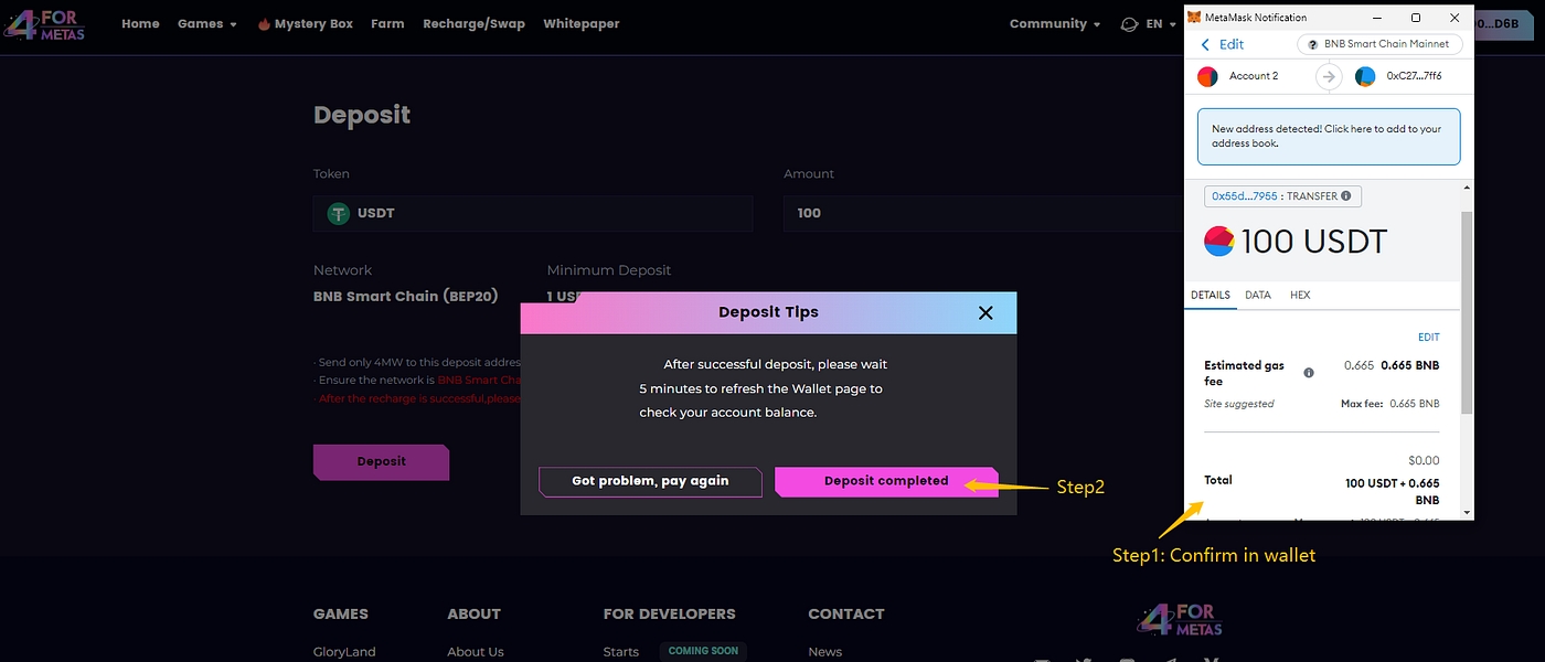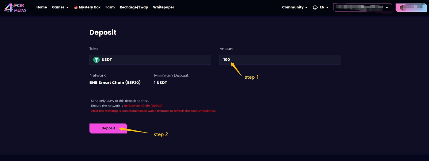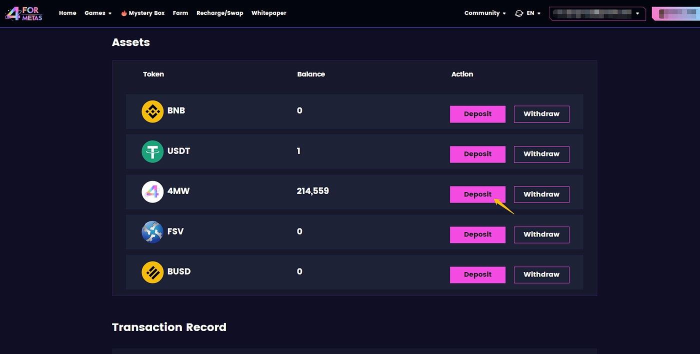 Go to the My Wallet page under the email navigation bar. Click “Deposit” (https://www.4metas.io/#/transactionRecord)